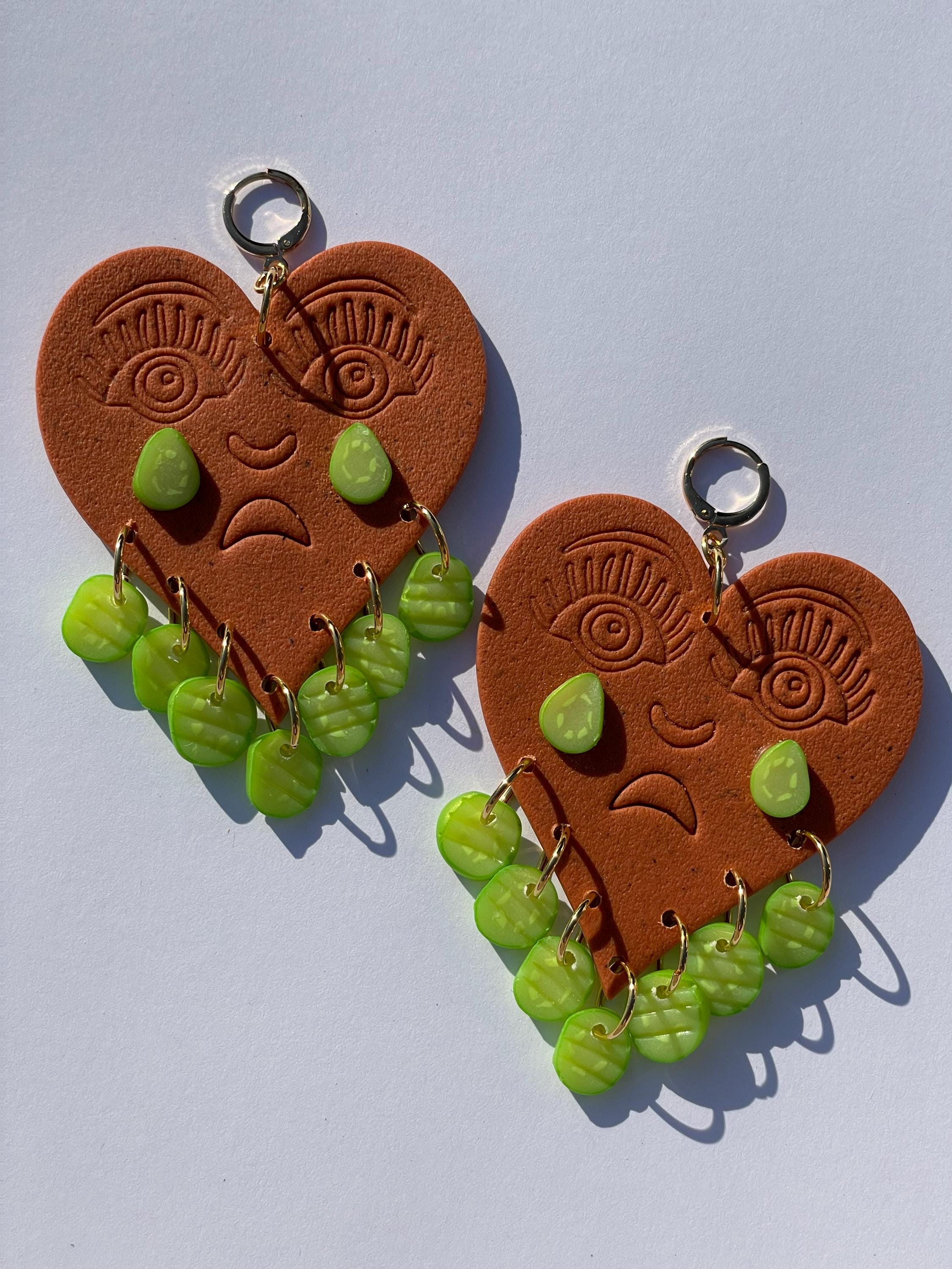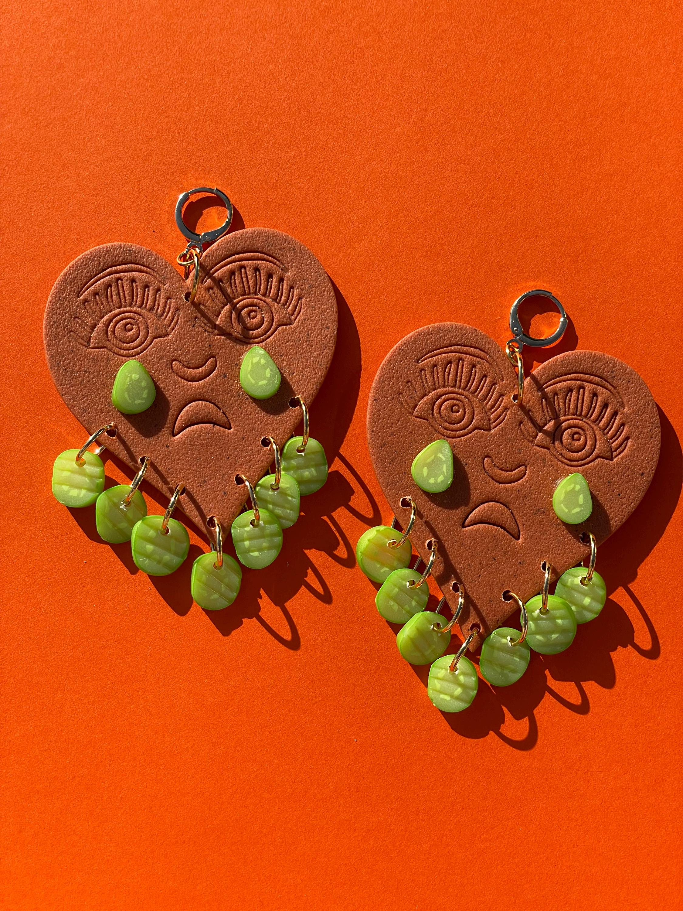 Do not bend or drop earrings. Wipe clay clean with a damp cloth or a q-tip dipped in acetone for stuck on stains. Do not use acetone on painted pieces.