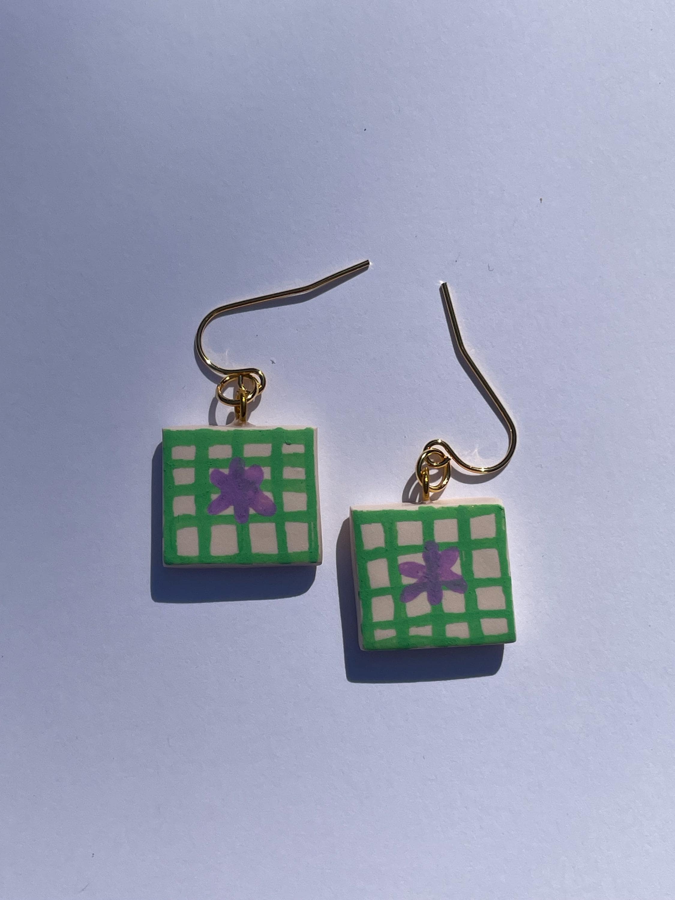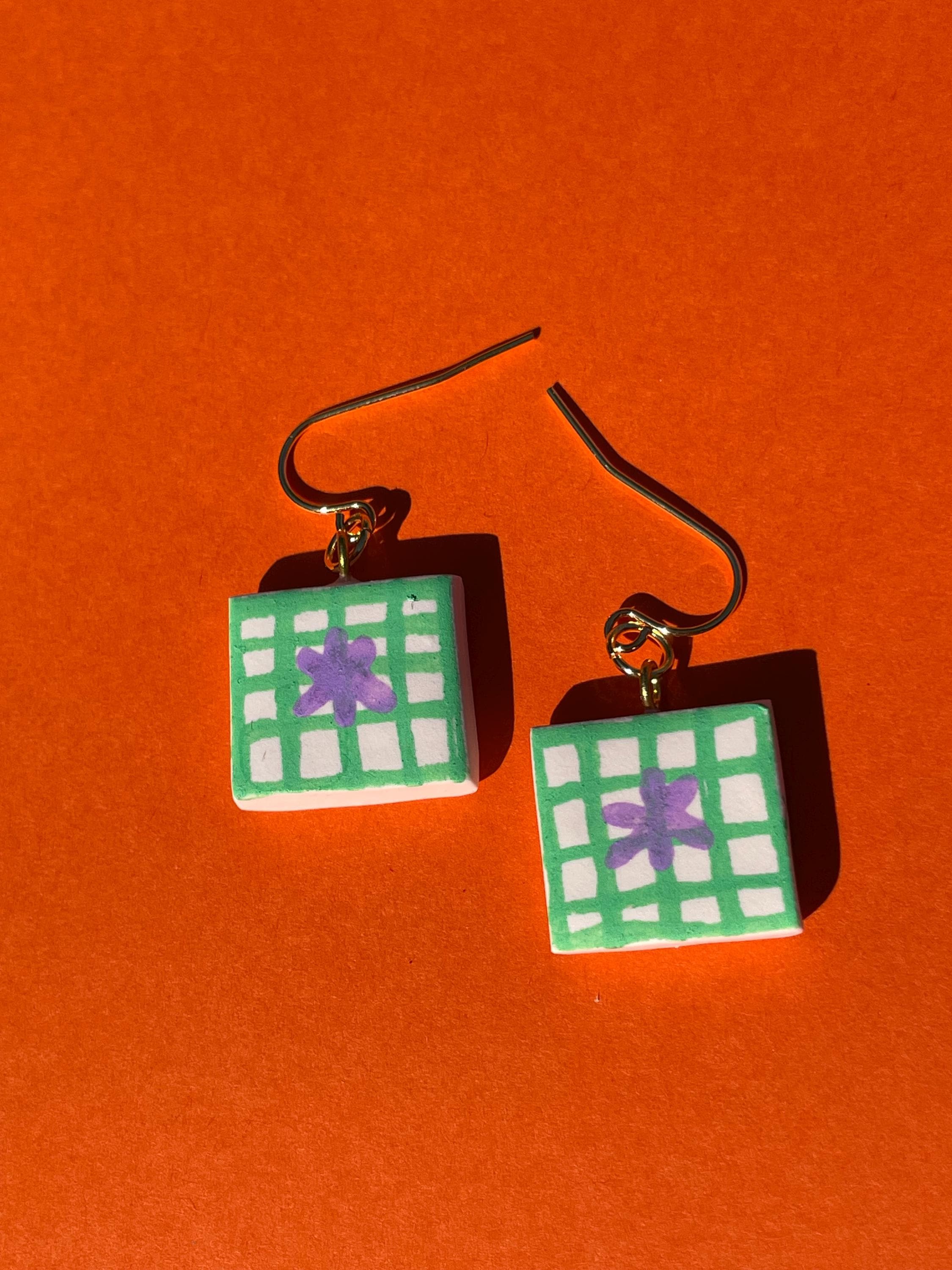 Do not bend or drop earrings. Wipe clay clean with a damp cloth or a q-tip dipped in acetone for stuck on stains. Do not use acetone on painted pieces.