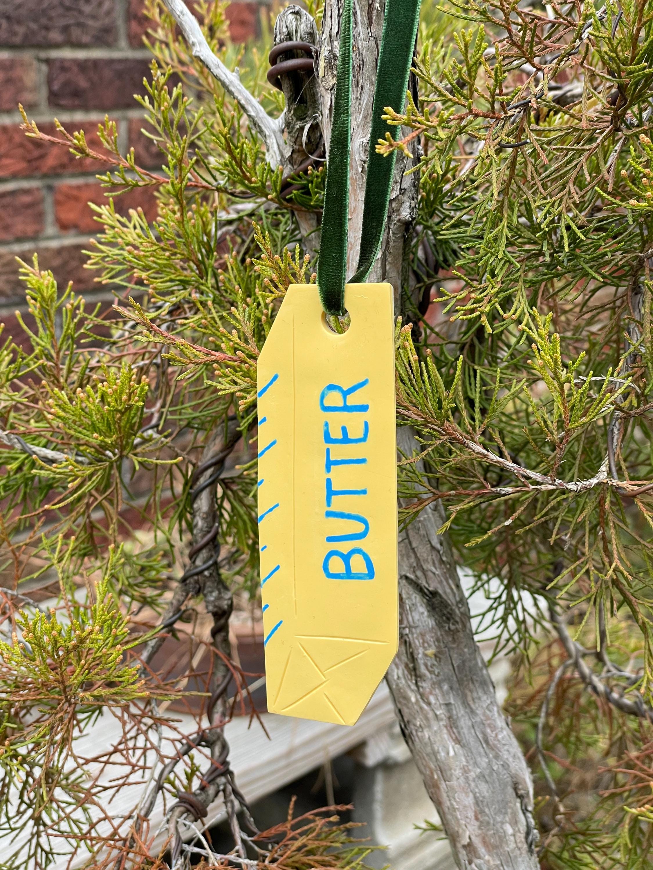 Measures at 5” long, 1.5” wide (9.5” long with ribbon)