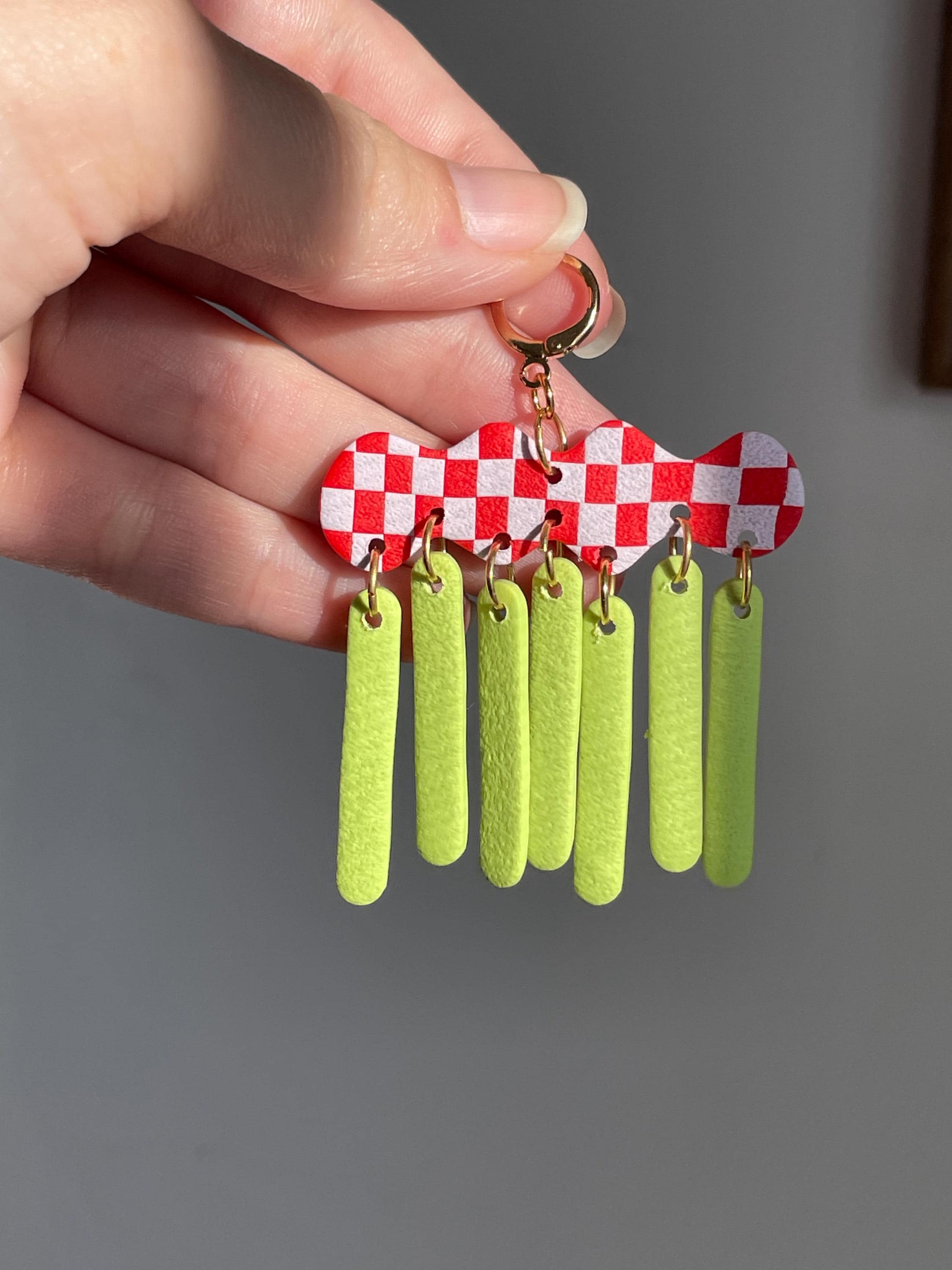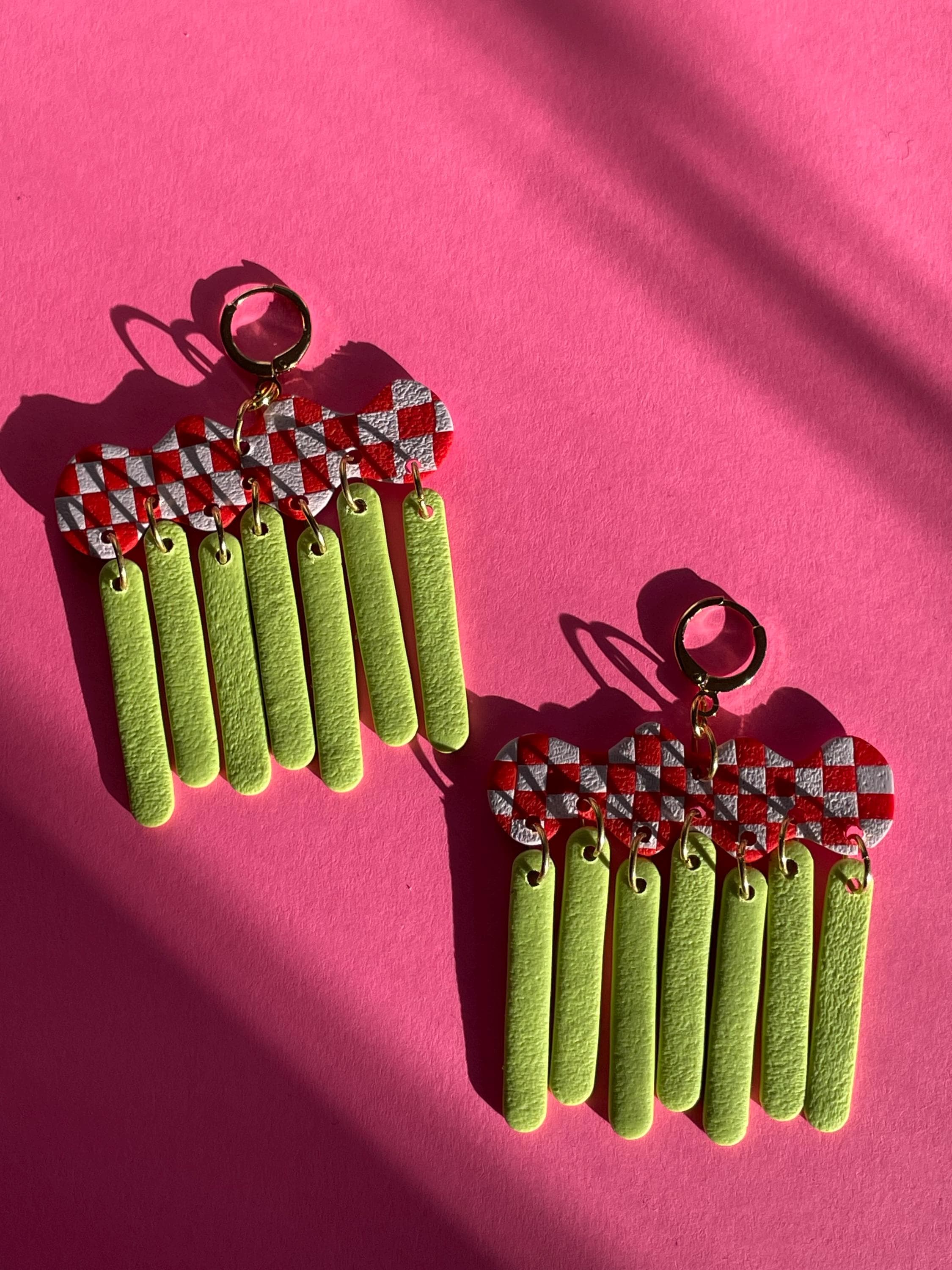 Do not bend or drop earrings. Wipe clay clean with a damp cloth or a q-tip dipped in acetone for stuck on stains. Do not use acetone on painted pieces.