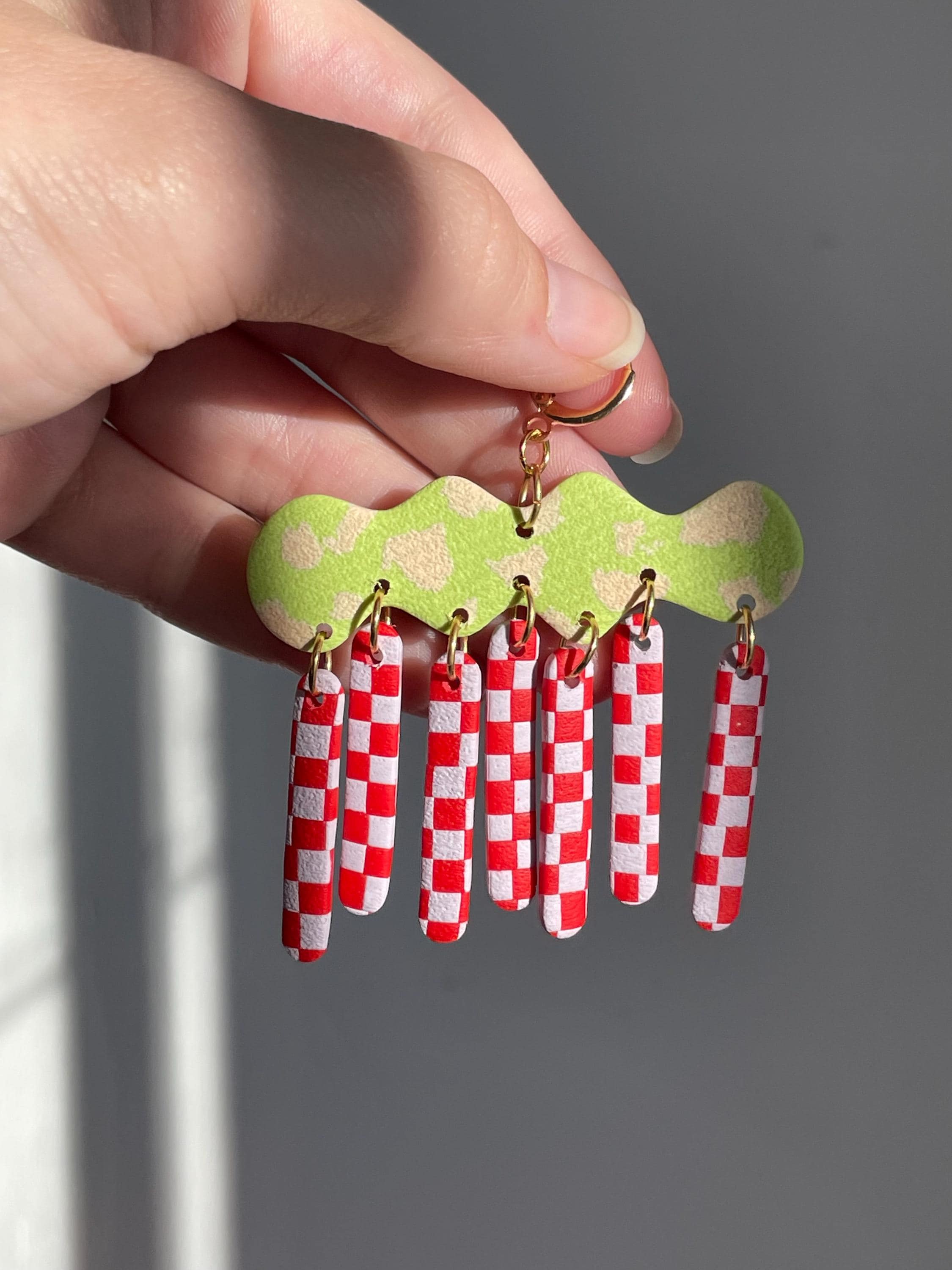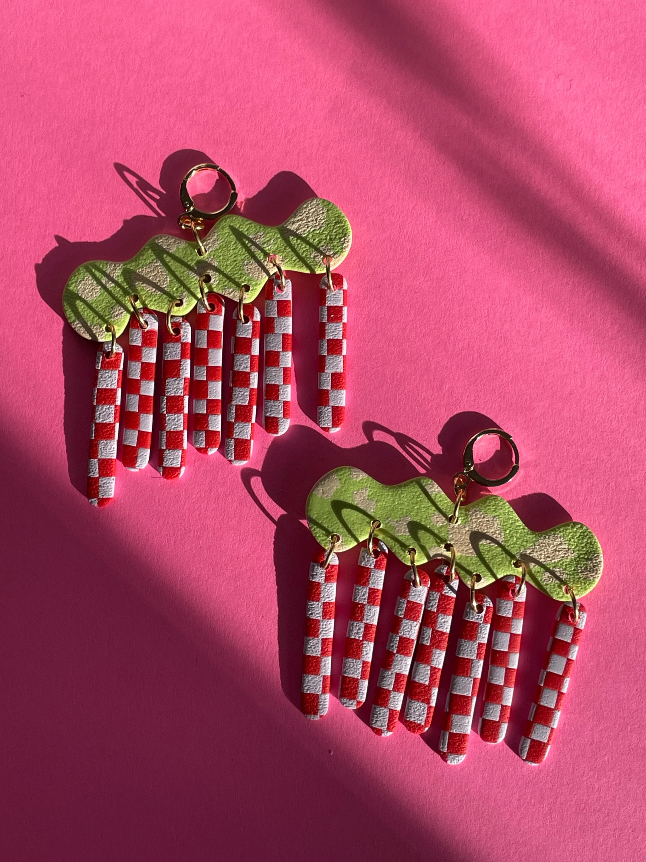 Do not bend or drop earrings. Wipe clay clean with a damp cloth or a q-tip dipped in acetone for stuck on stains. Do not use acetone on painted pieces.
