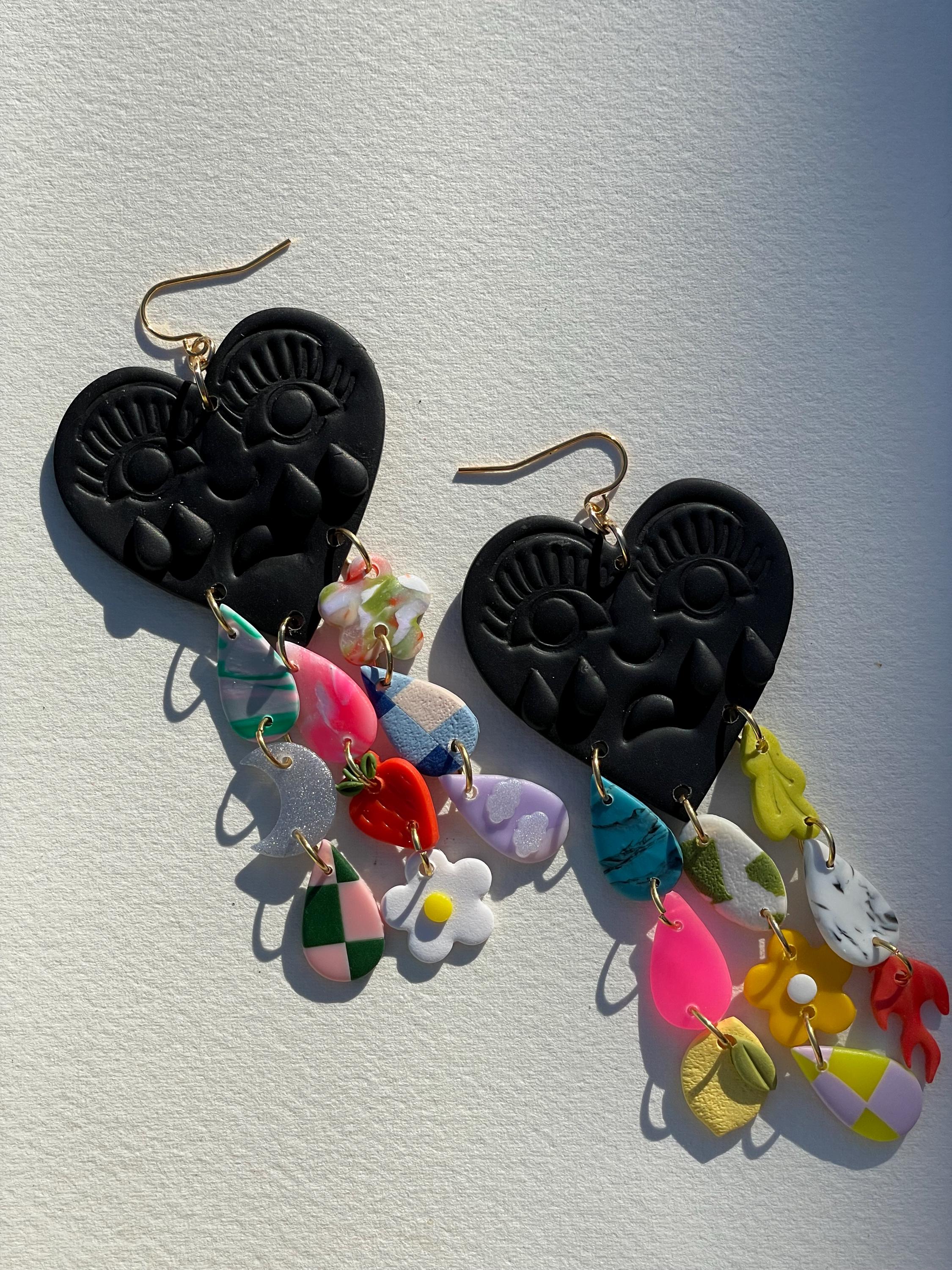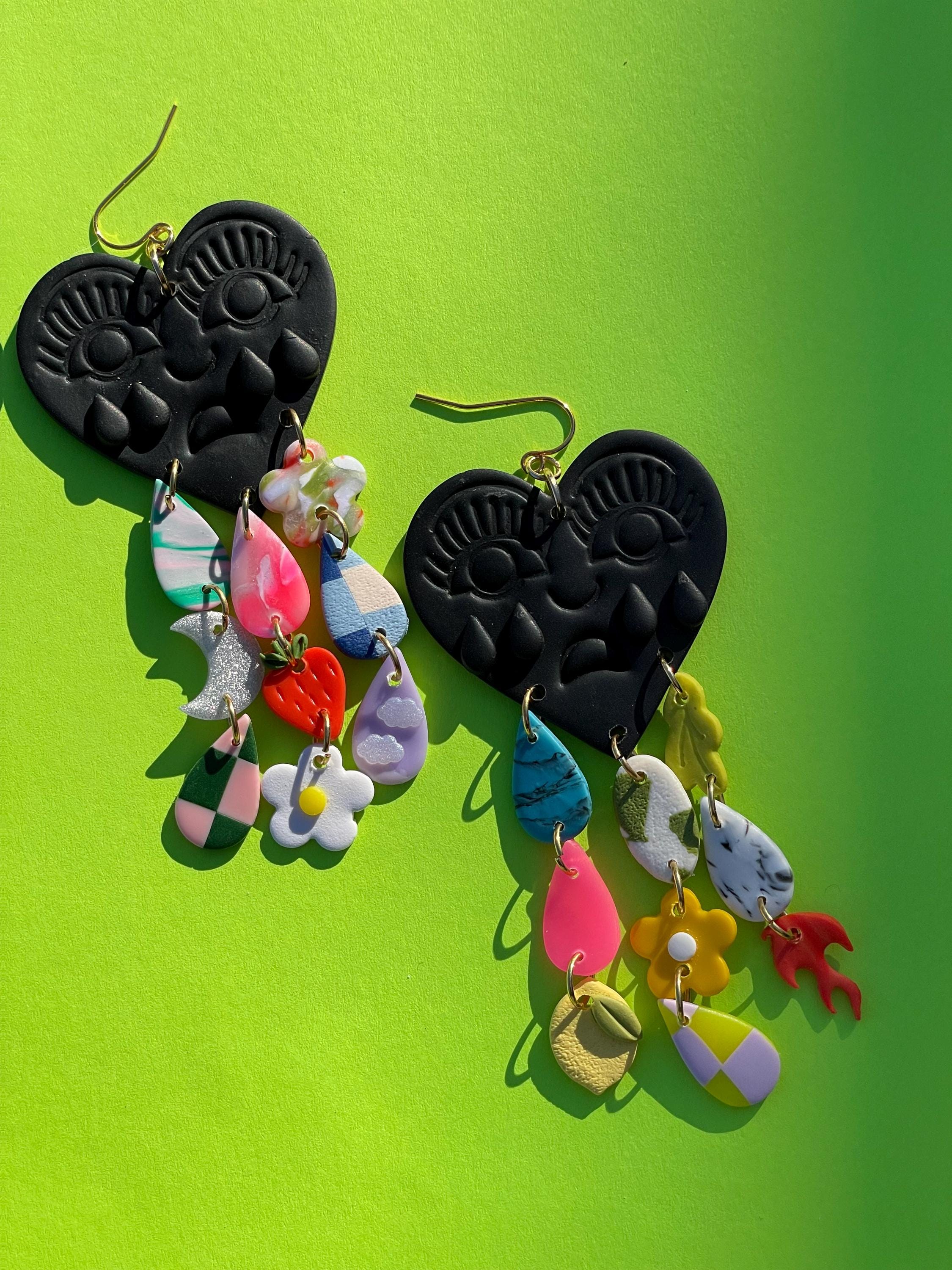 Do not bend or drop earrings. Wipe clay clean with a damp cloth or a q-tip dipped in acetone for stuck on stains. Do not use acetone on painted pieces.