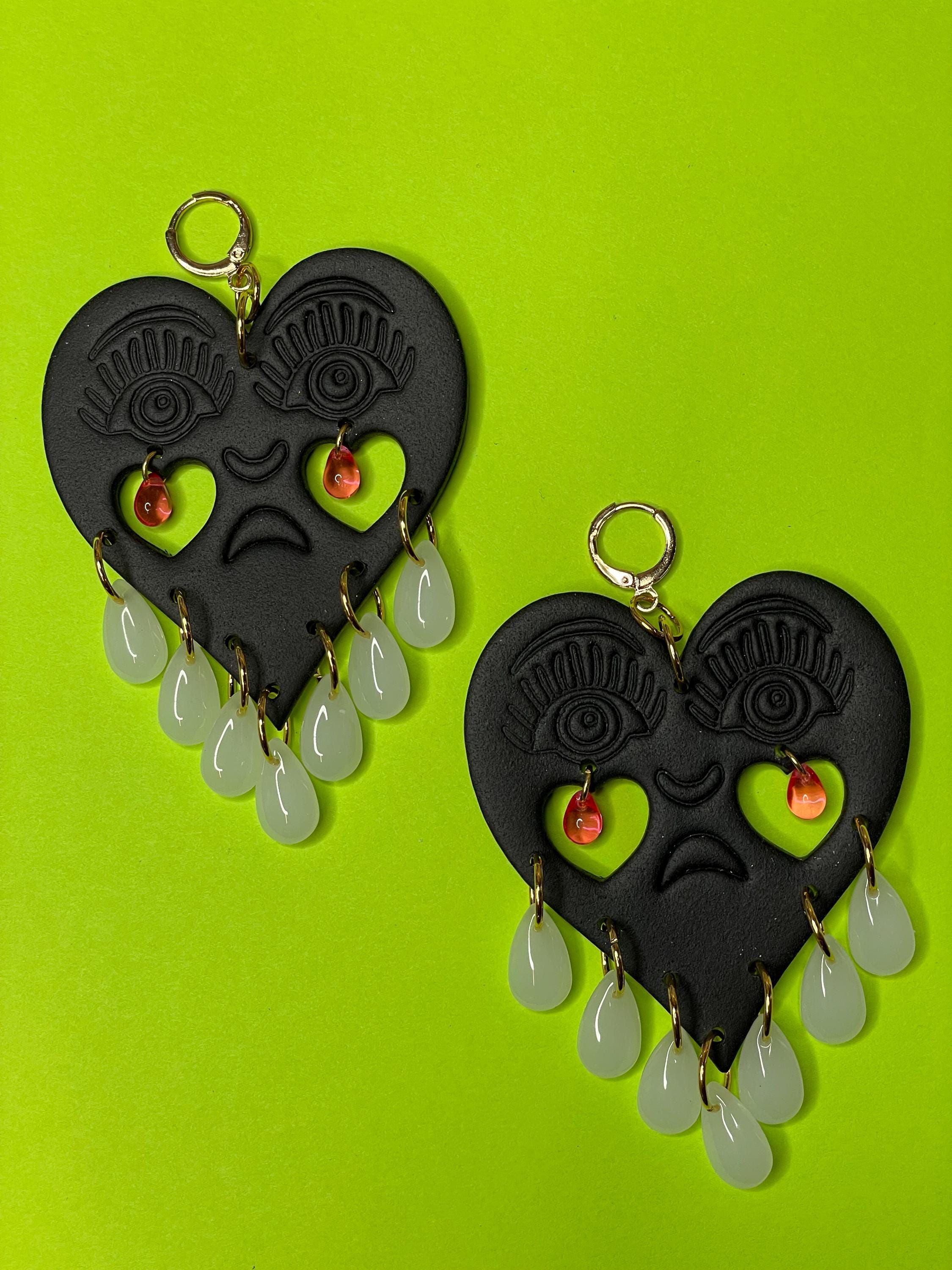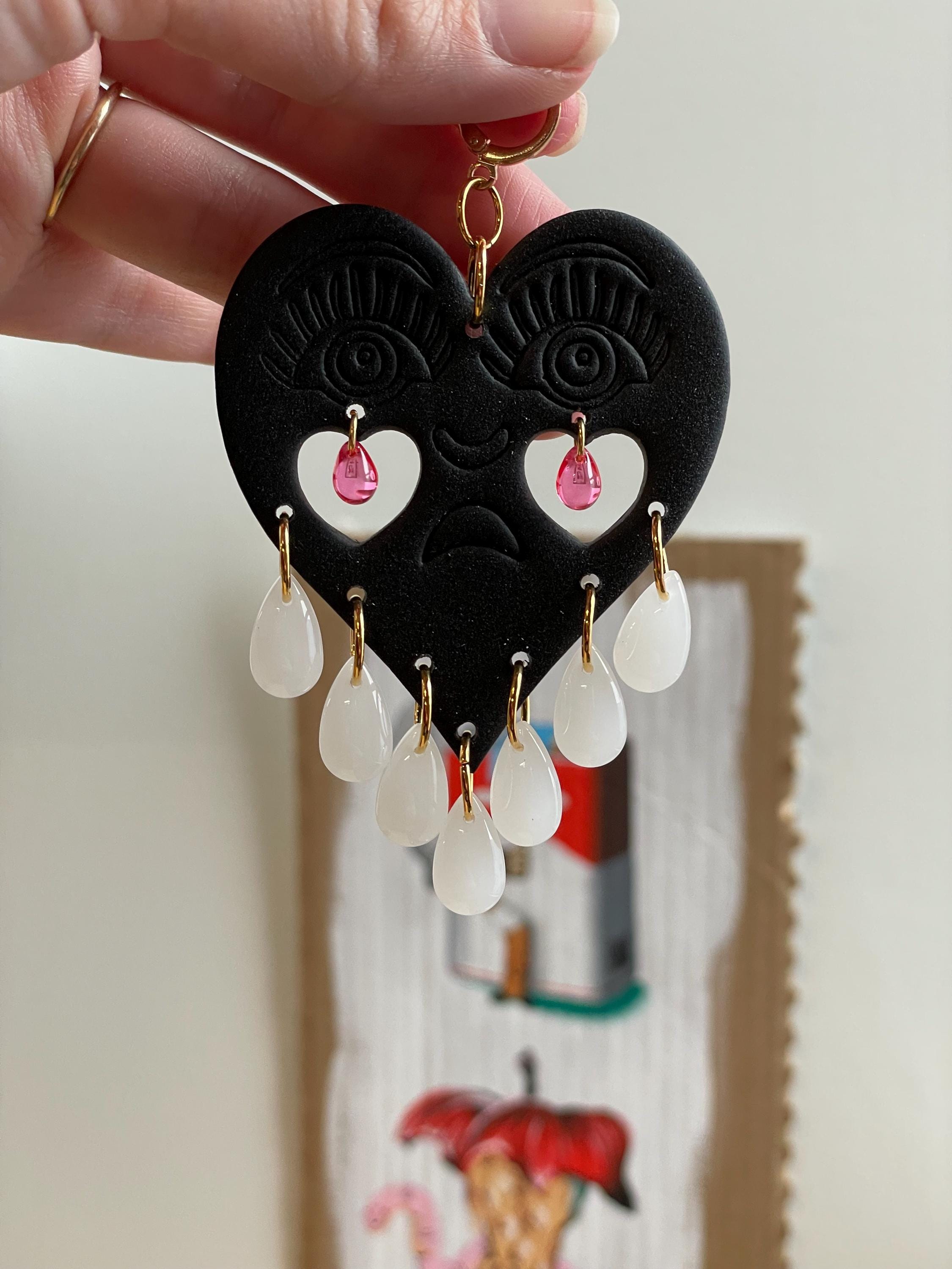 Do not bend or drop earrings. Wipe clay clean with a damp cloth or a q-tip dipped in acetone for stuck on stains. Do not use acetone on painted pieces.