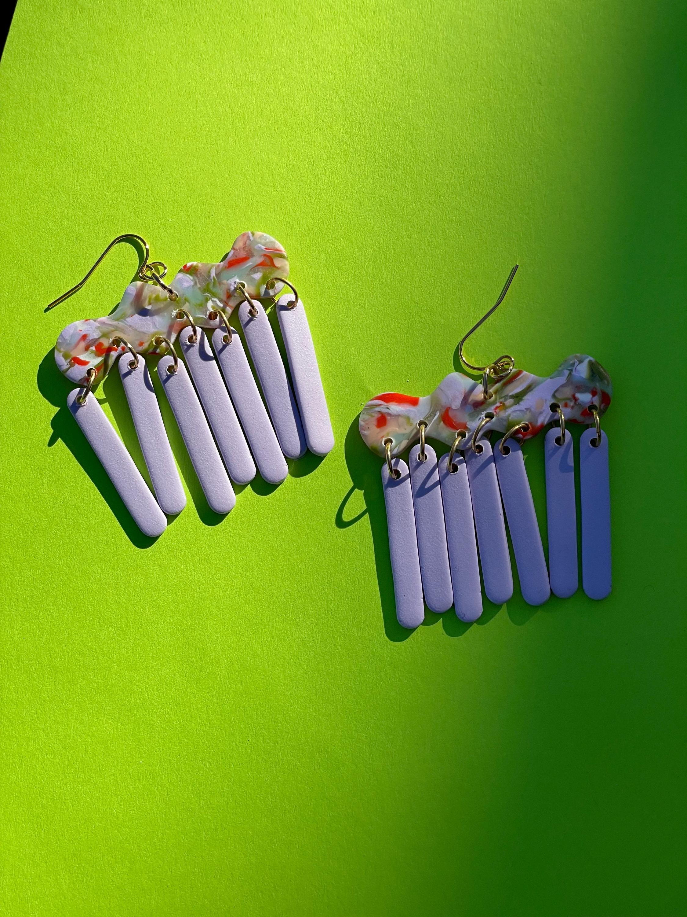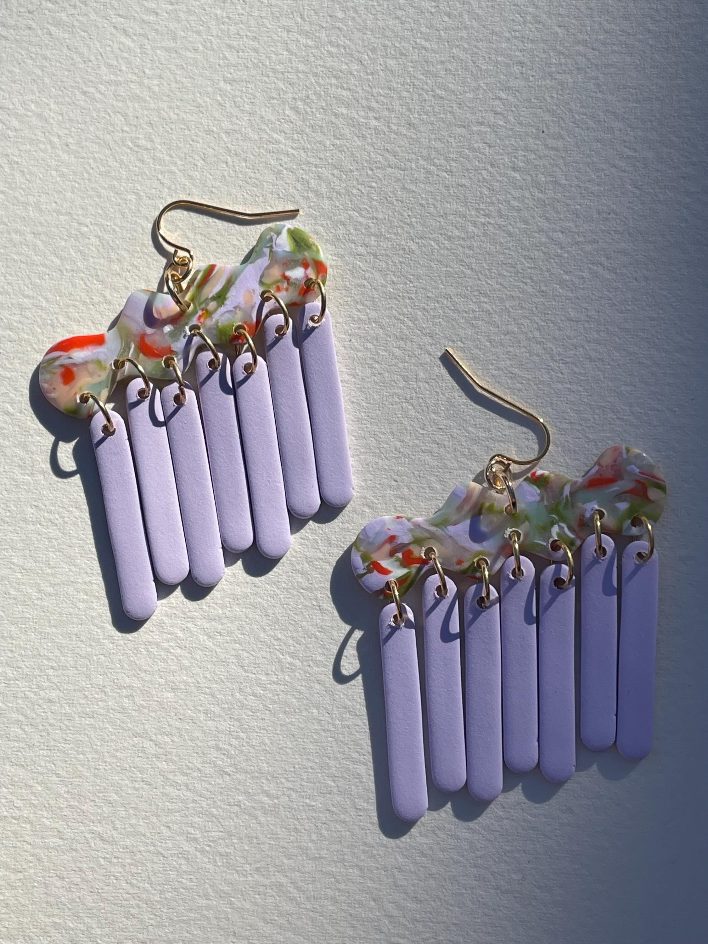 Do not bend or drop earrings. Wipe clay clean with a damp cloth or a q-tip dipped in acetone for stuck on stains. Do not use acetone on painted pieces.