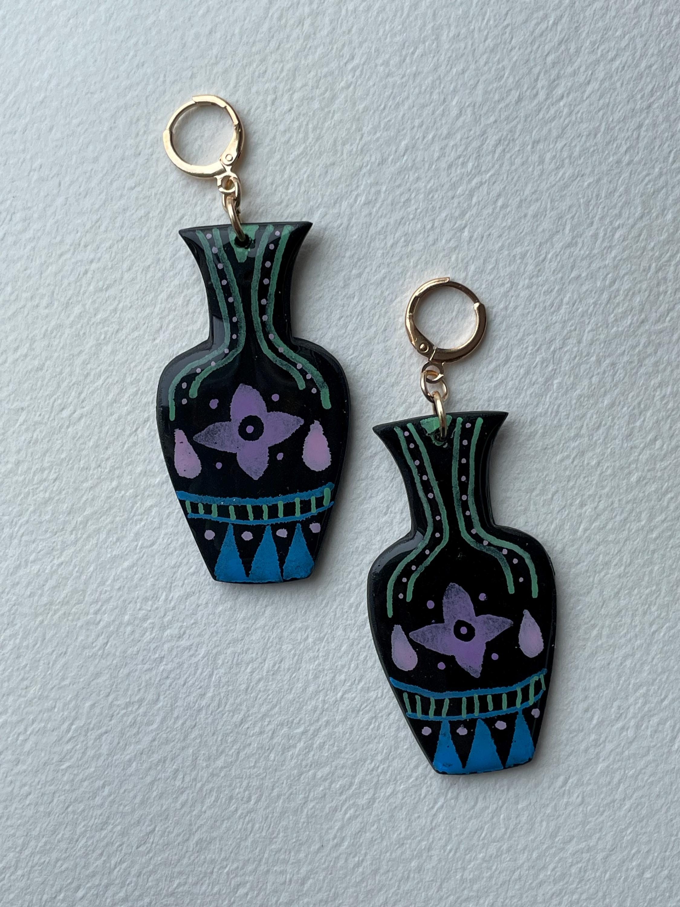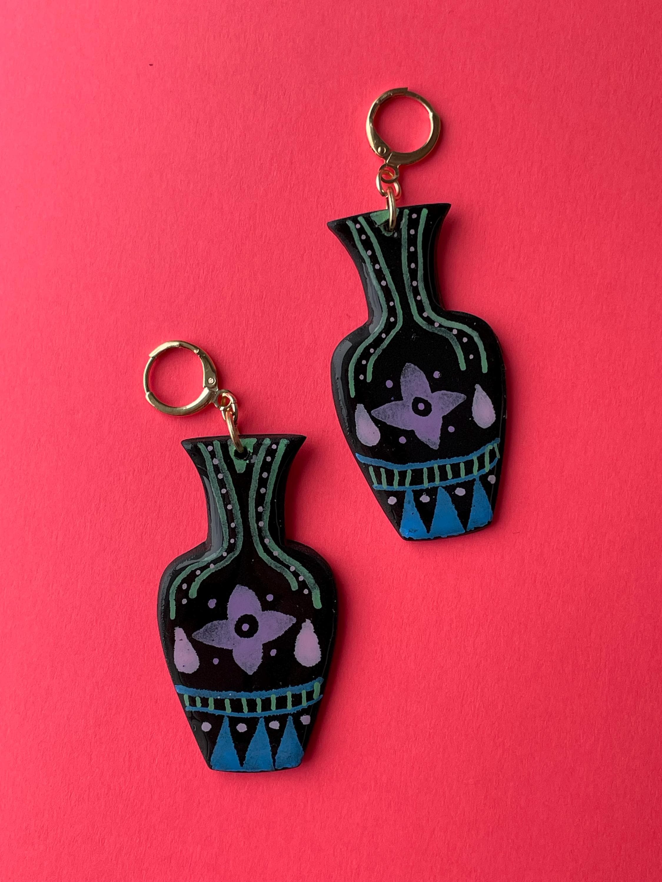 Do not bend or drop earrings. Wipe clay clean with a damp cloth or a q-tip dipped in acetone for stuck on stains. Do not use acetone on painted pieces.