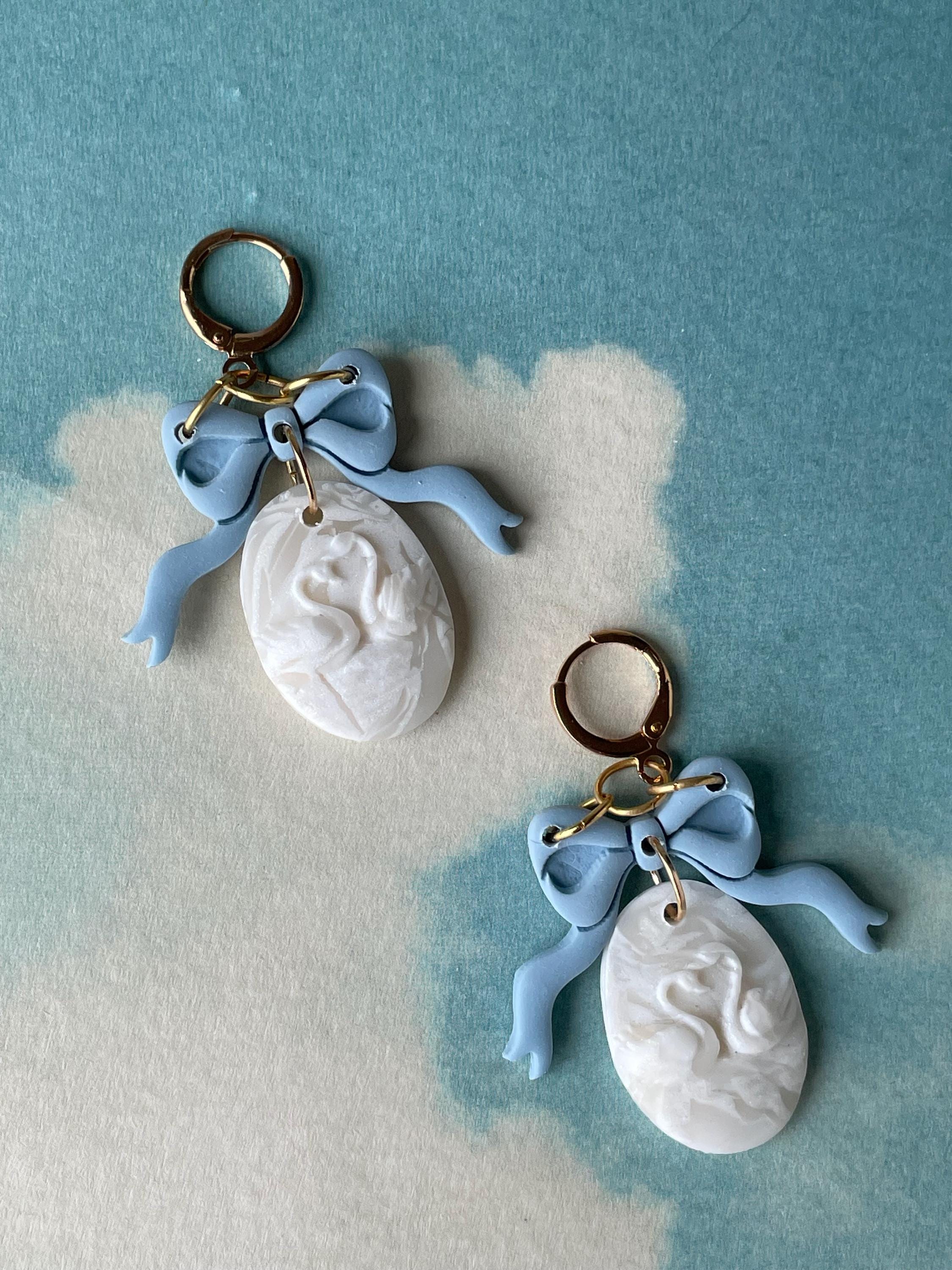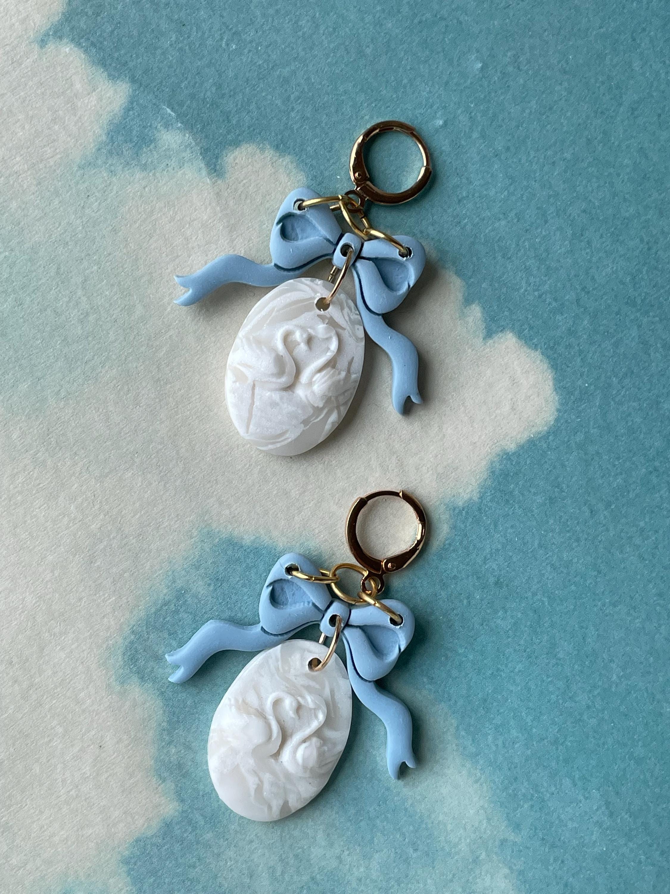 Hot and elegant - blue bows with handmade molded swan charms - every pair is unique!