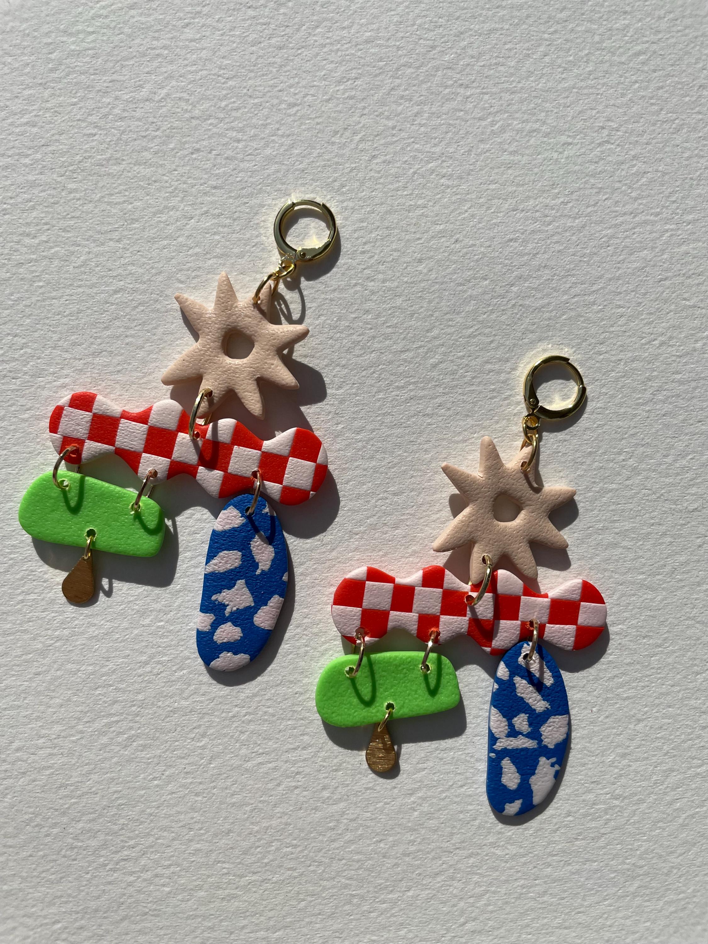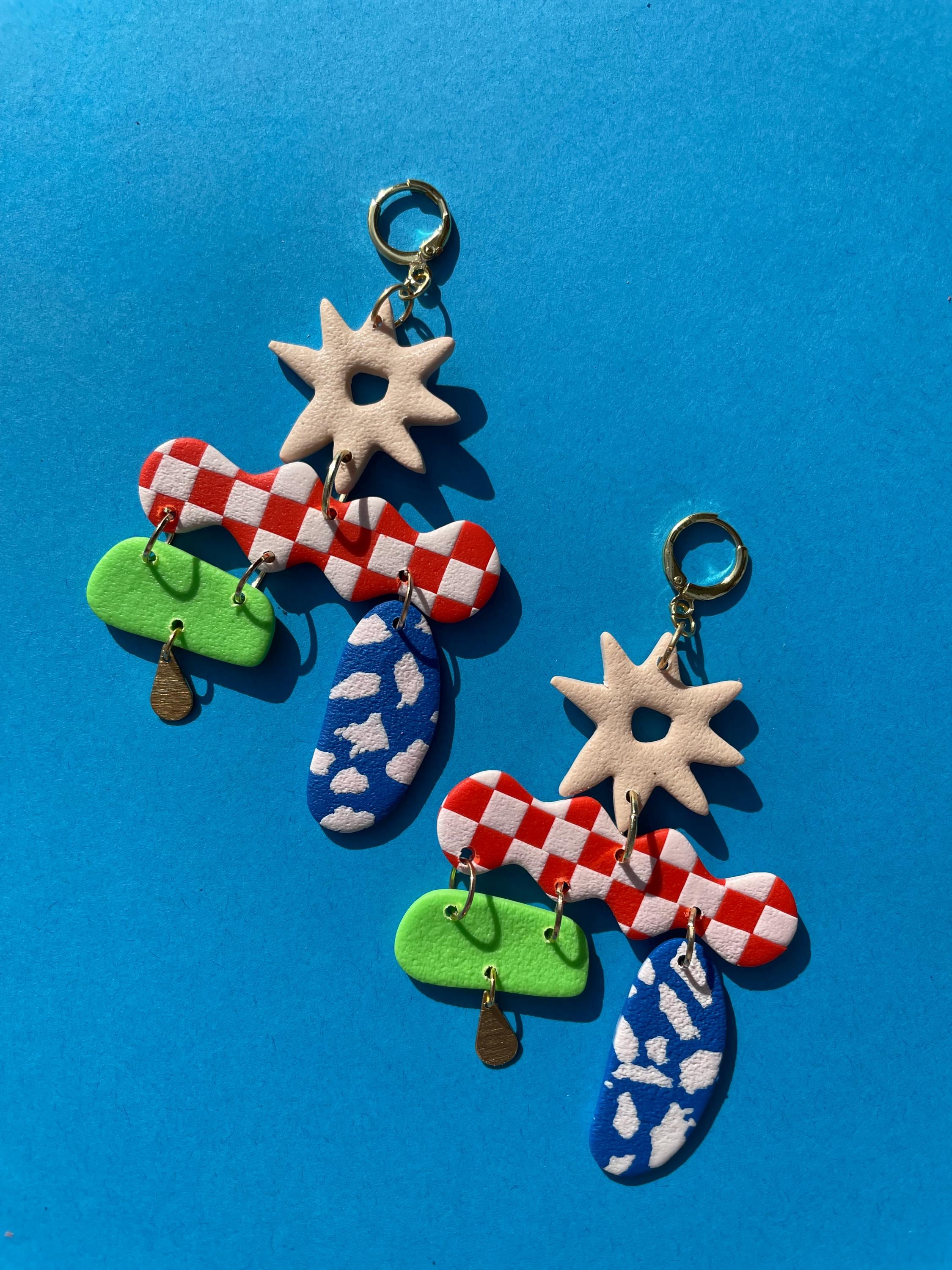 Do not bend or drop earrings. Wipe clay clean with a damp cloth or a q-tip dipped in acetone for stuck on stains. Do not use acetone on painted pieces.